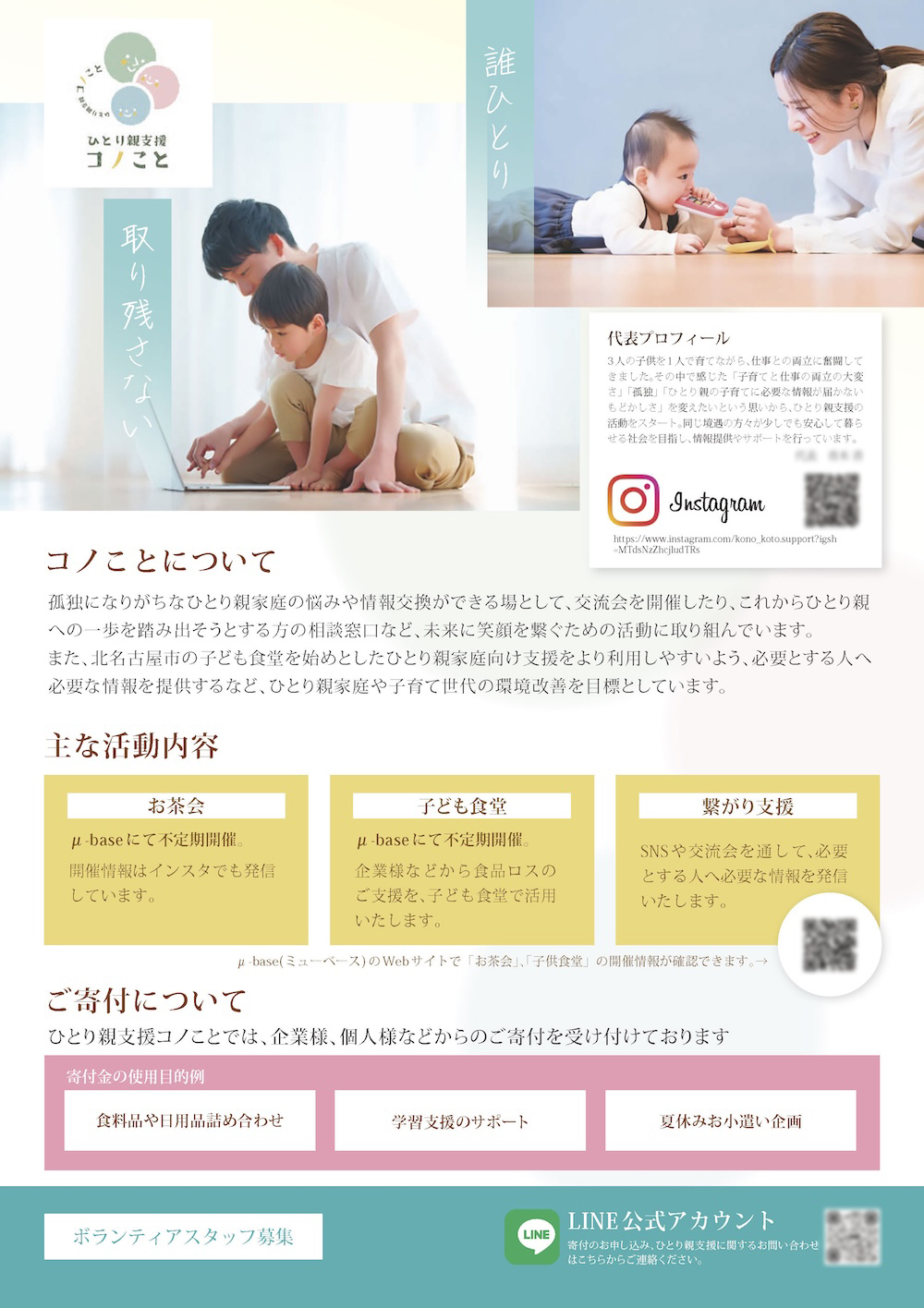 デザインは、優しい団体代表の人柄を表すように柔らかな色合いで統一。代表ご自身も一人親として抱いている切実な思いを丁寧にヒアリングし、その言葉をコピーとして反映しました。